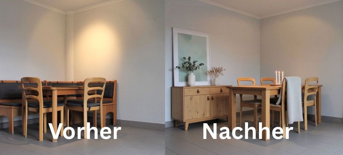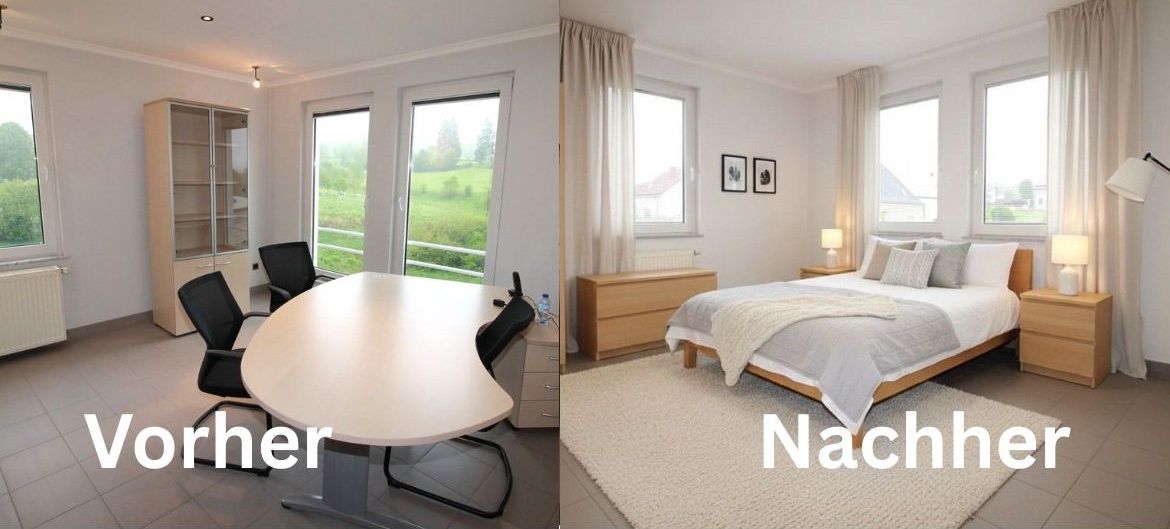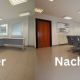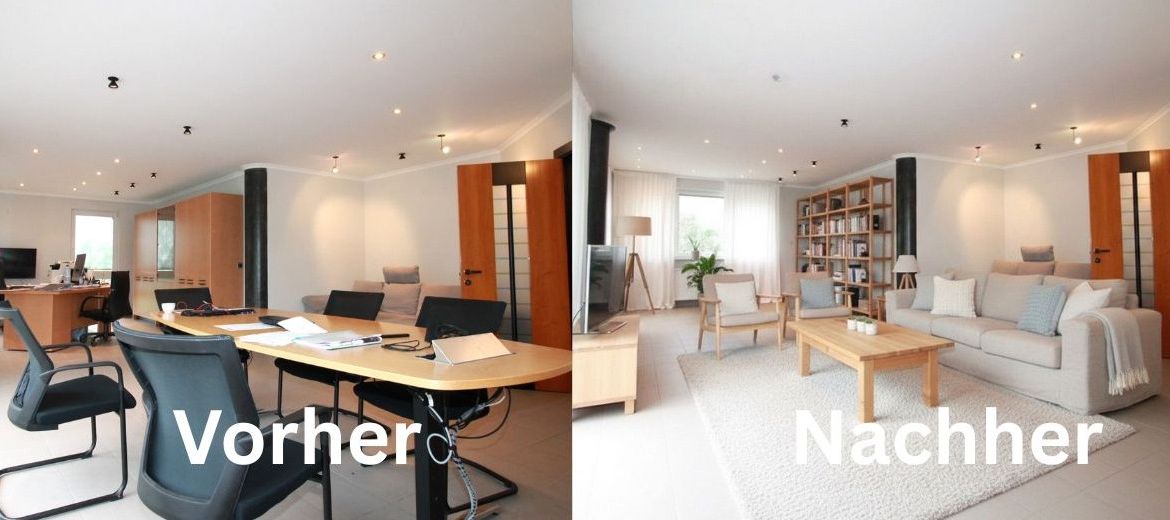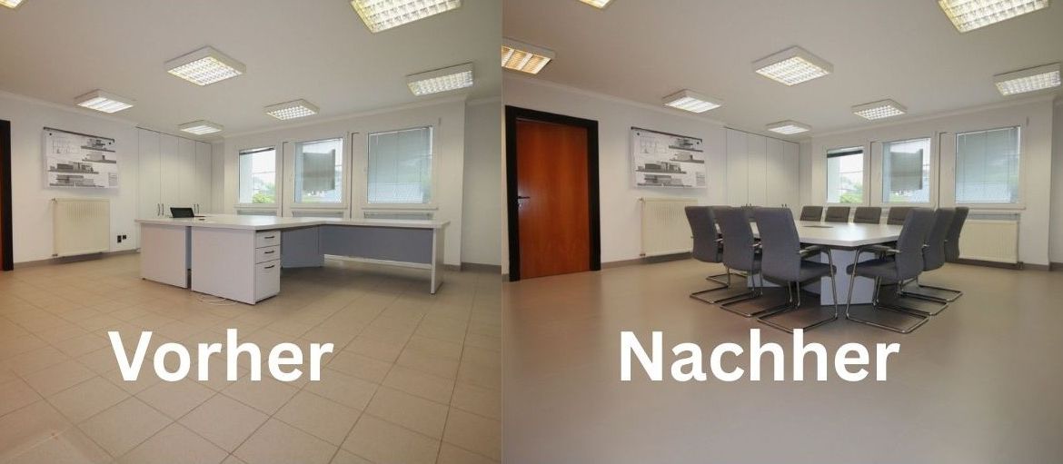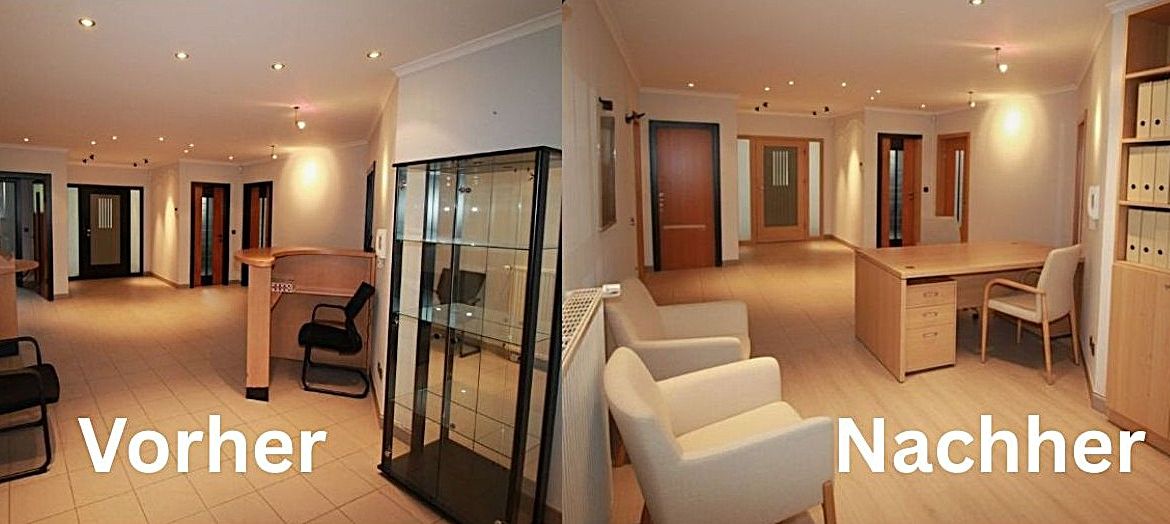 Die gezeigten Visualisierungen und Vorher-/Nachher-Fotos dienen ausschließlich als Ideenvorschlag und zeigen, wie die Fläche nach einem möglichen Umbau aussehen könnte. Der aktuelle Zustand der Räumlichkeiten entspricht den „Vorher“-Bildern und nicht den dargestellten Umbau-Visualisierungen. Genau darin liegt jedoch das Potenzial: Die vorhandene Bürostruktur bietet eine solide Grundlage, um eigene Ideen und Wohnkonzepte umzusetzen.